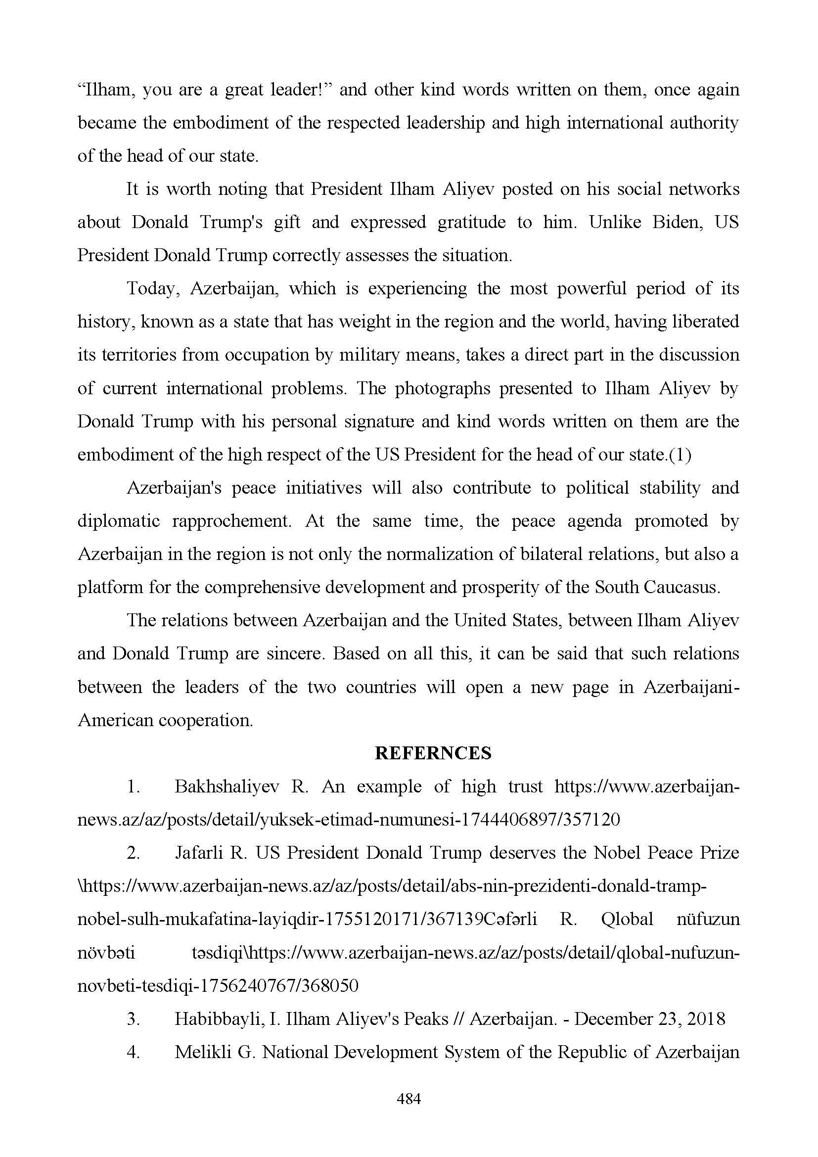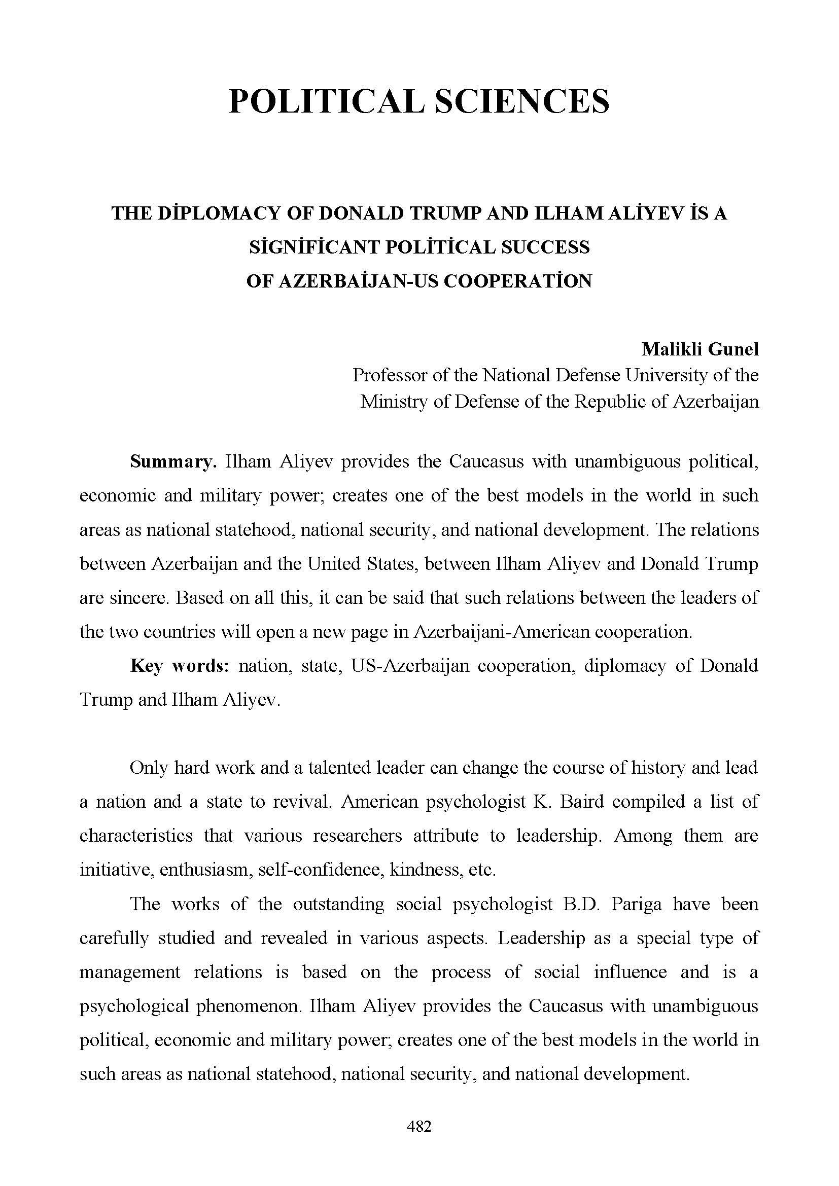 AMEA-nın Fəlsəfə və Sosiologiya İnstitutunun şöbə müdiri, gənc alim siyasi elmlər üzrə fəlsəfə doktoru, dosent Günel Məlikli Ali Baş Komandan, Prezident İlham Əliyevin xarici siyasətinə həsr edilmiş “THE DIPLOMACY OF DONALD TRUMP AND ILHAM ALIYEV IS A SIGNIFICANT POLITICAL SUCCESS OF AZERBAIJAN-US COOPERATION” mövzusunda ABŞ-nın Çikaqo şəhərində keçirilən Beynəlxalq konfransın materialında nəşr olunub.